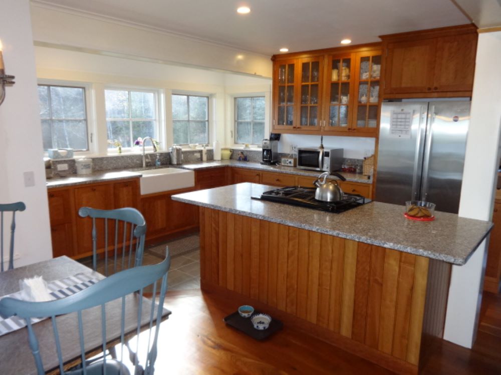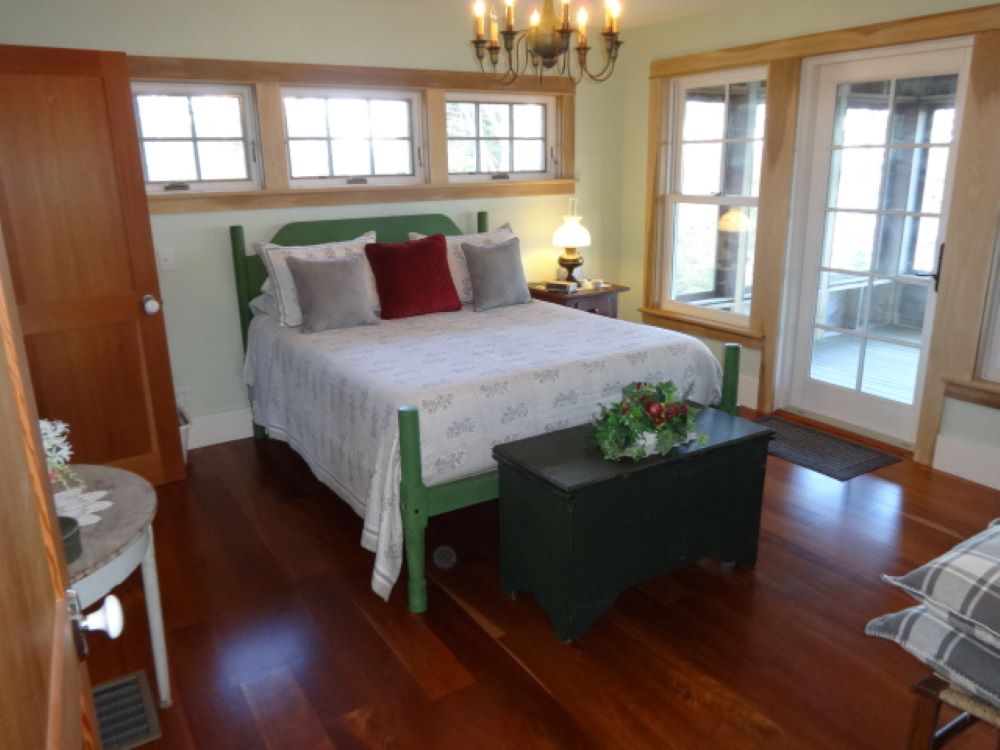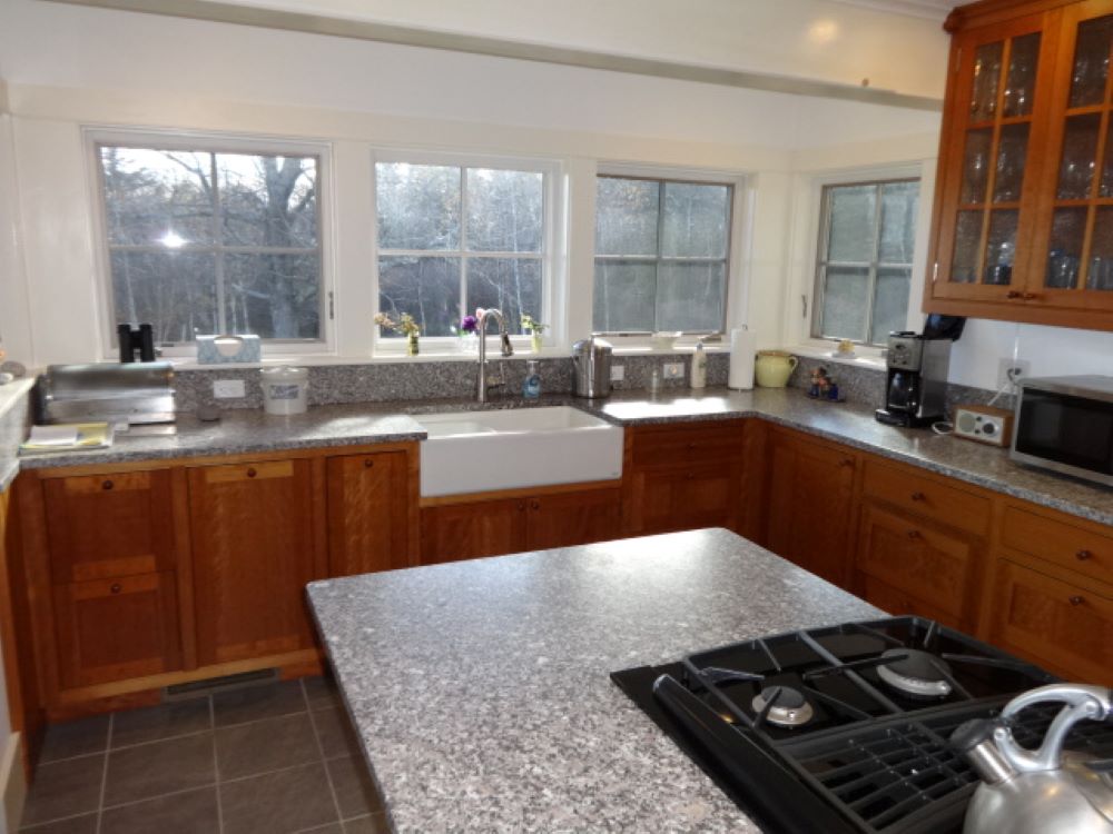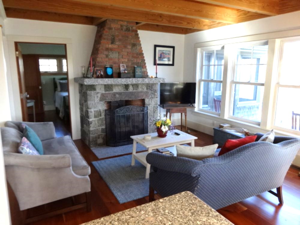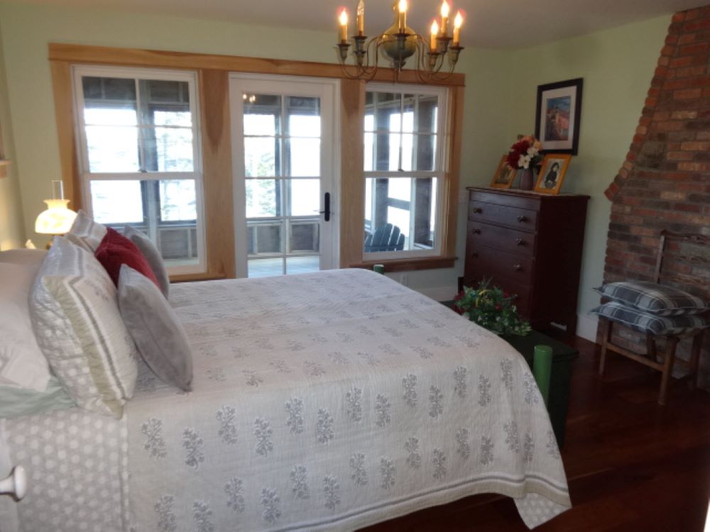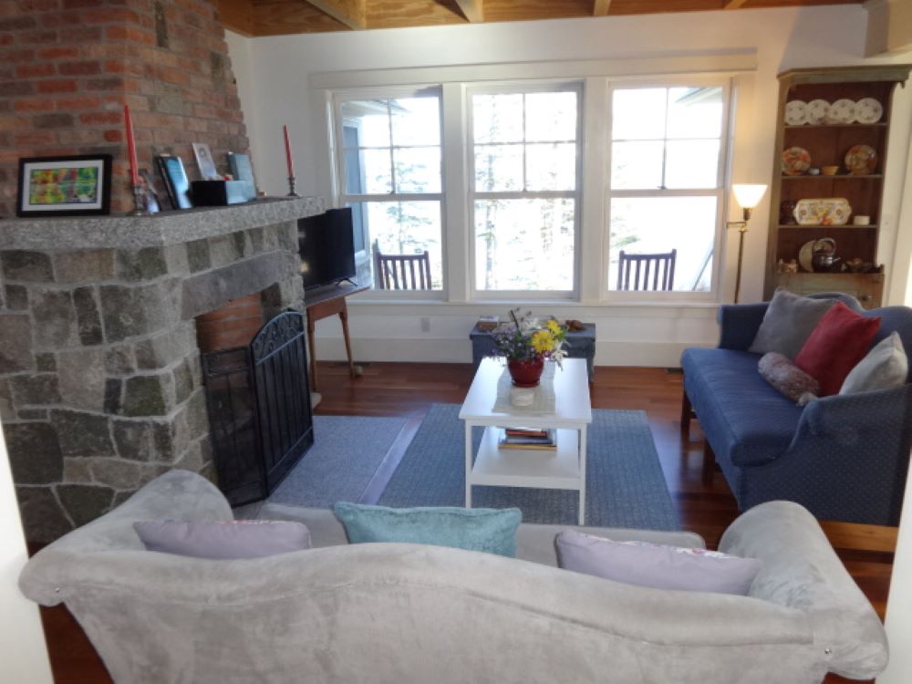 The home features an open concept with stone fireplaced living room, sunny kitchen with granite counter tops and farmer sink, and a nice dining area, all with garden and water views, and opening to the two screened porches and open deck, which provide lots of space for your outdoor enjoyment, and a pantry/laundry room. Additionally, there is a roomy first floor bedroom with a door to one of the screened porches, walk-in closet, bath with shower.