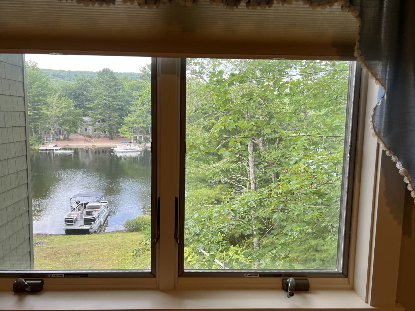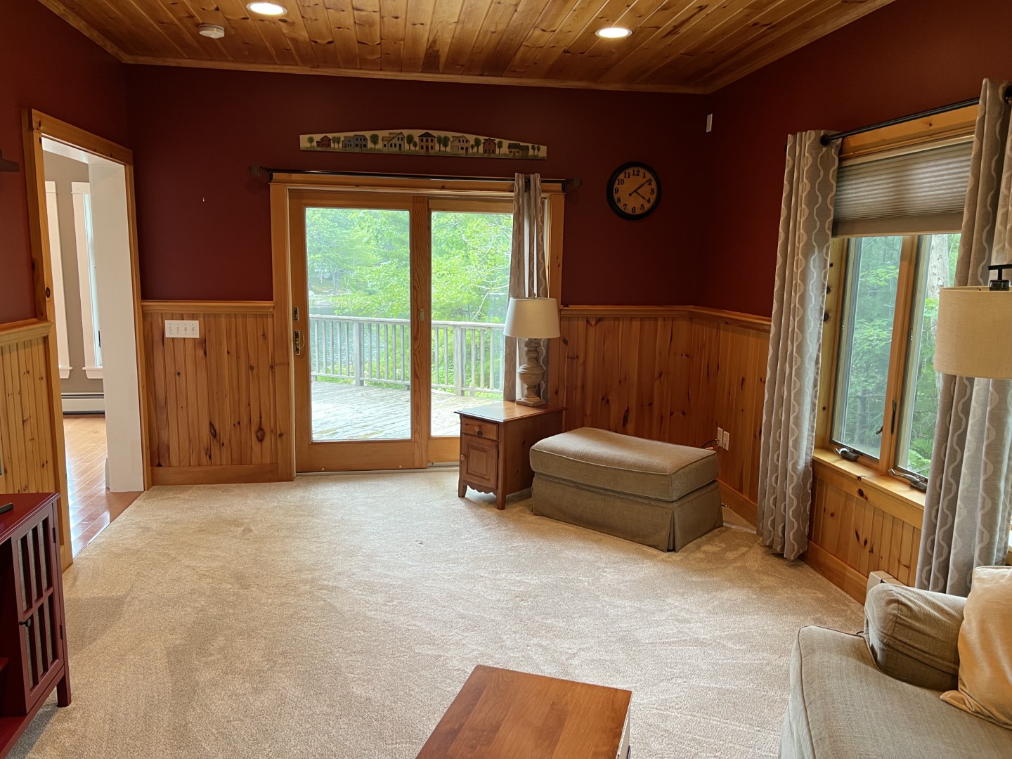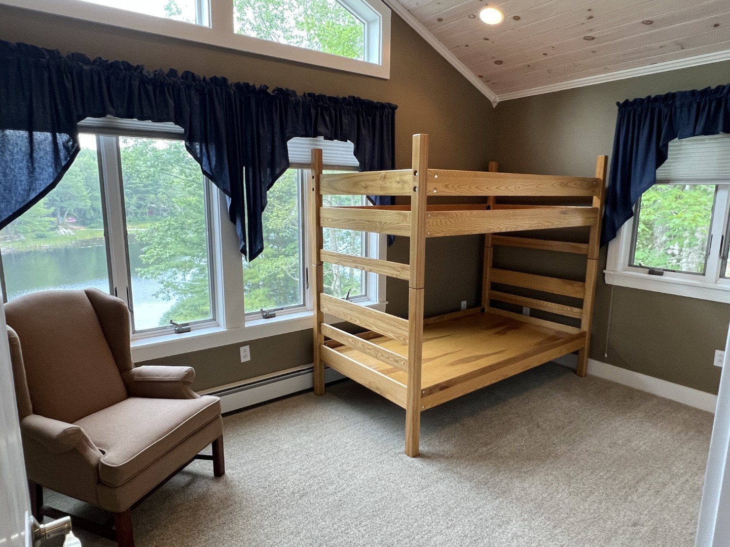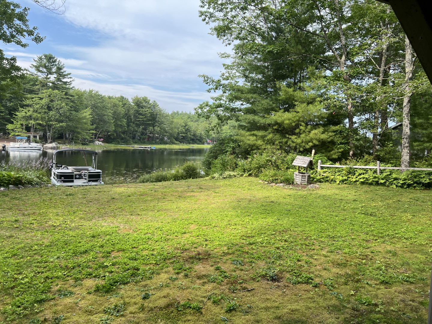 This year round home offers pond enjoyment through all the seasons. The nicely laid out kitchen has lots of storage with gas cook top and electric oven. There is plenty of dining room space for large gatherings or comfy chairs for watching pond activity. 9ft high ceilings add to the spacious feeling. The large living room has sliding glass doors to the deck and a propane stove for those cool mornings/evenings.