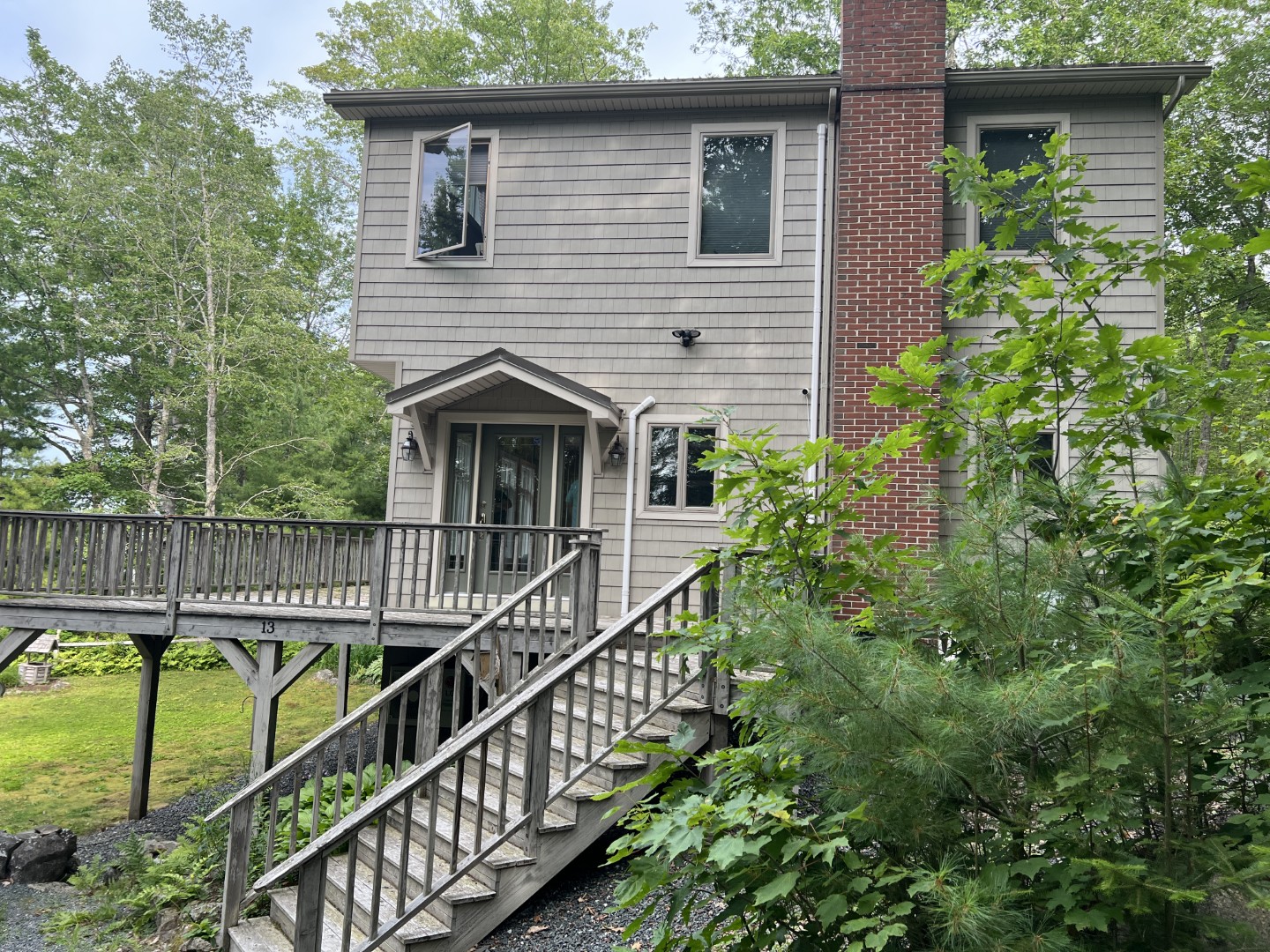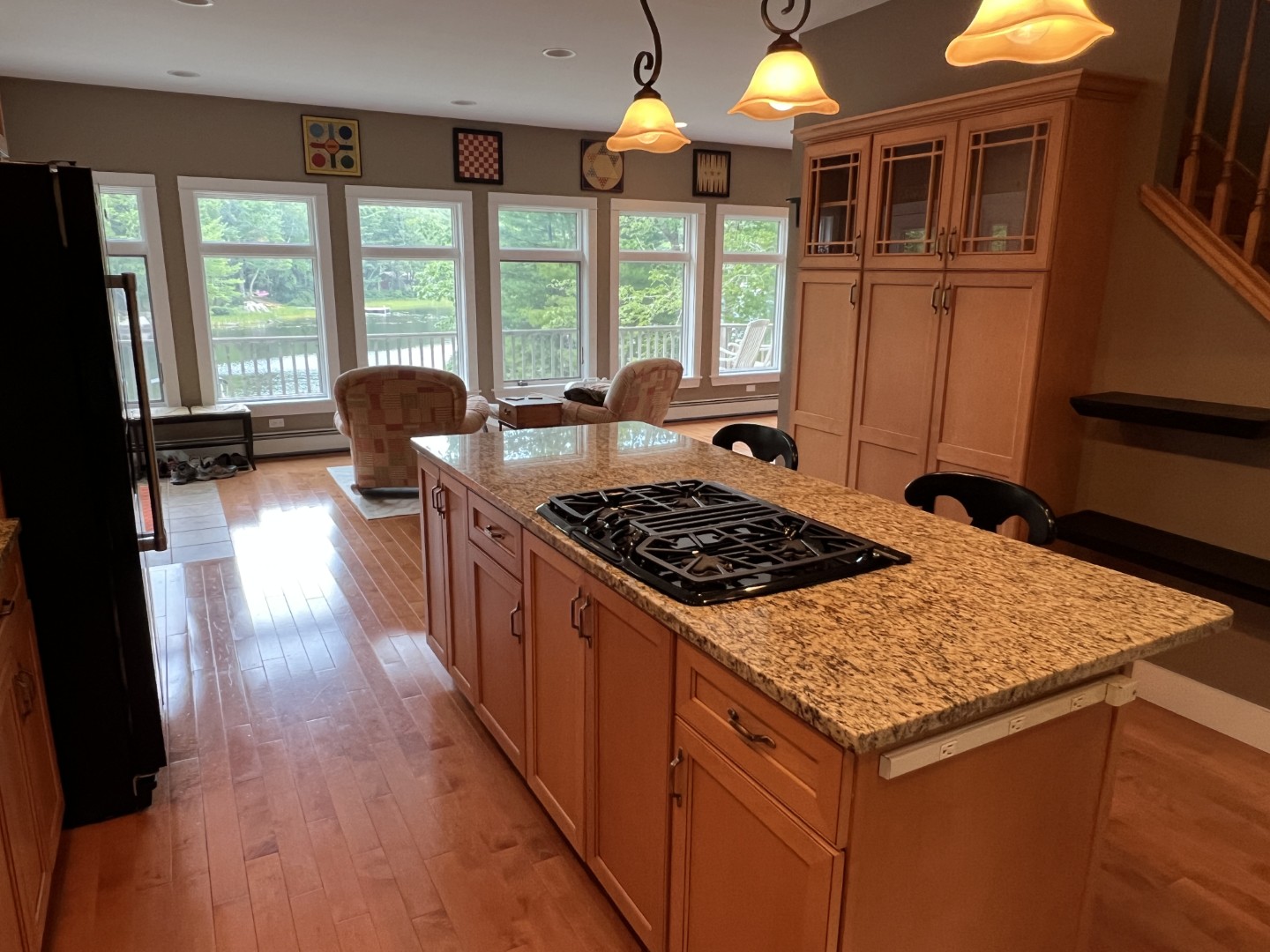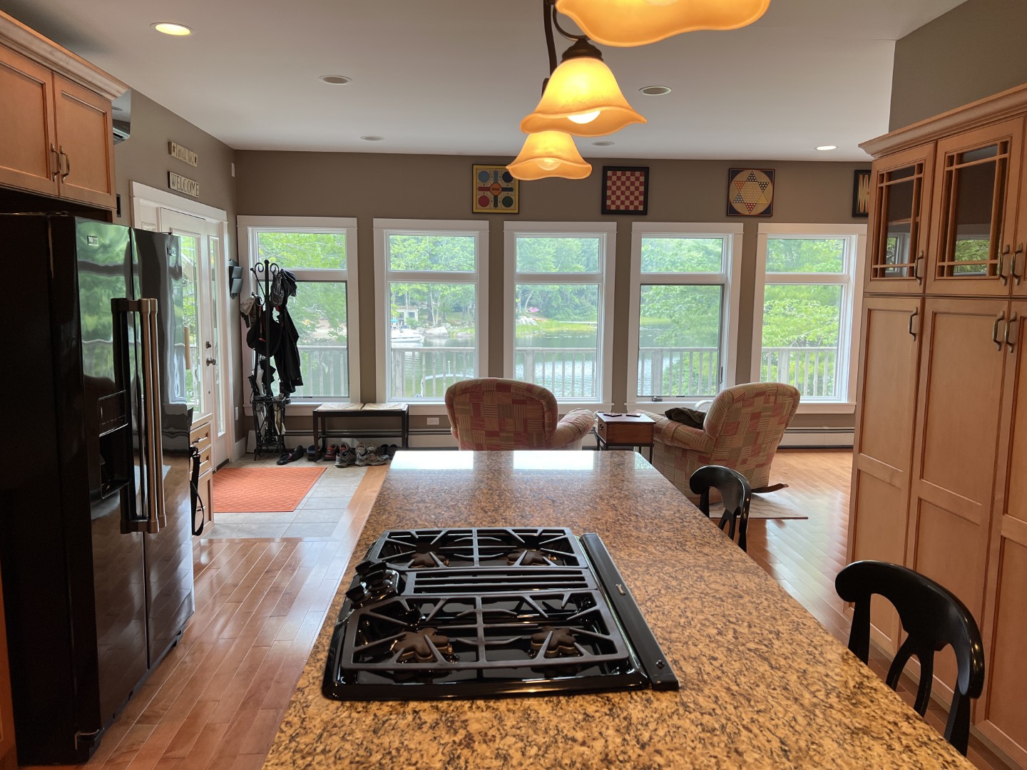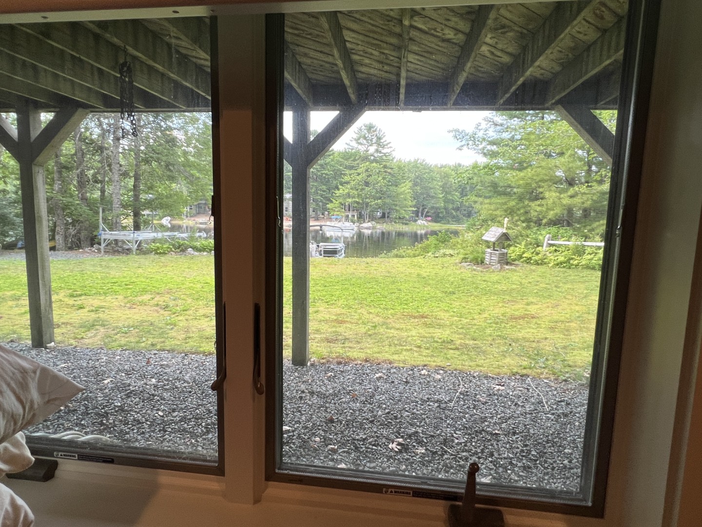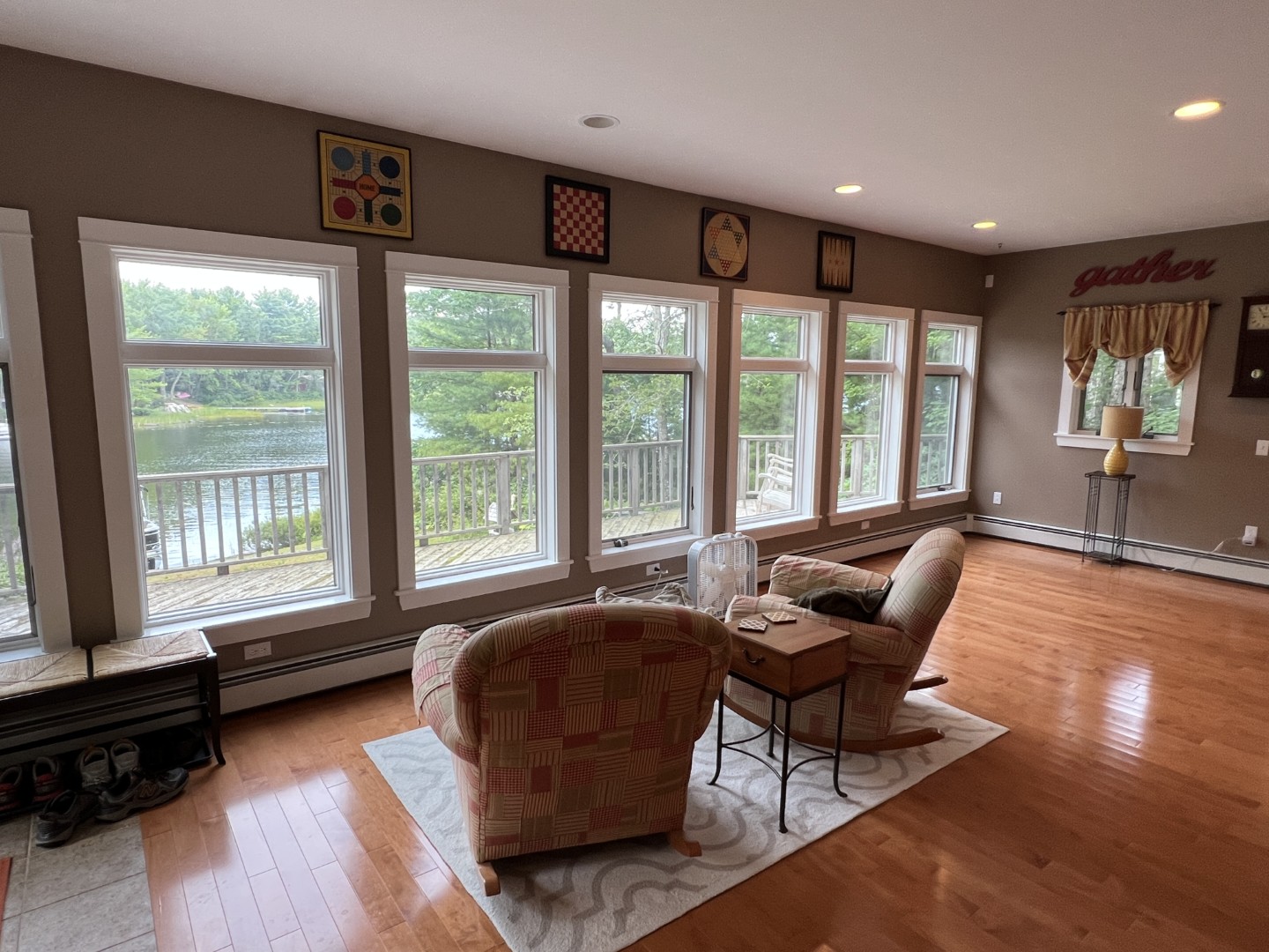 This year round home offers pond enjoyment through all the seasons. The nicely laid out kitchen has lots of storage with gas cook top and electric oven. There is plenty of dining room space for large gatherings or comfy chairs for watching pond activity. 9ft high ceilings add to the spacious feeling. The large living room has sliding glass doors to the deck and a propane stove for those cool mornings/evenings.