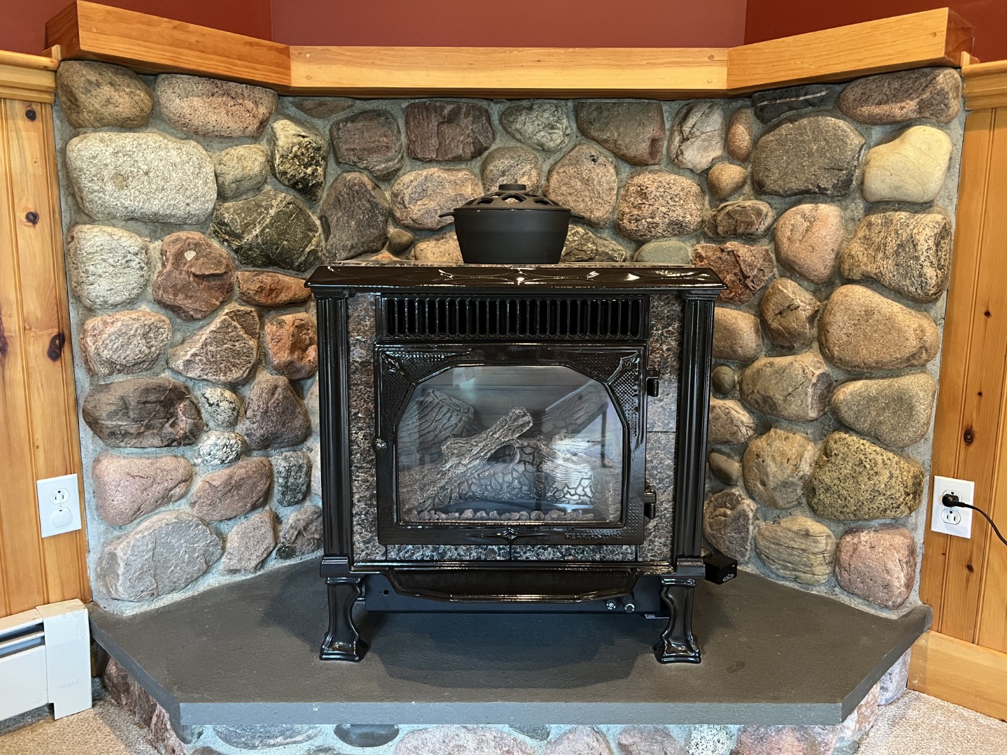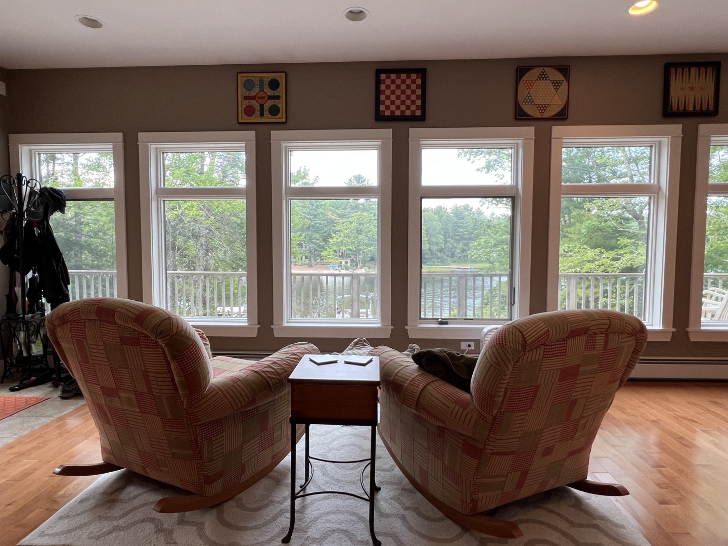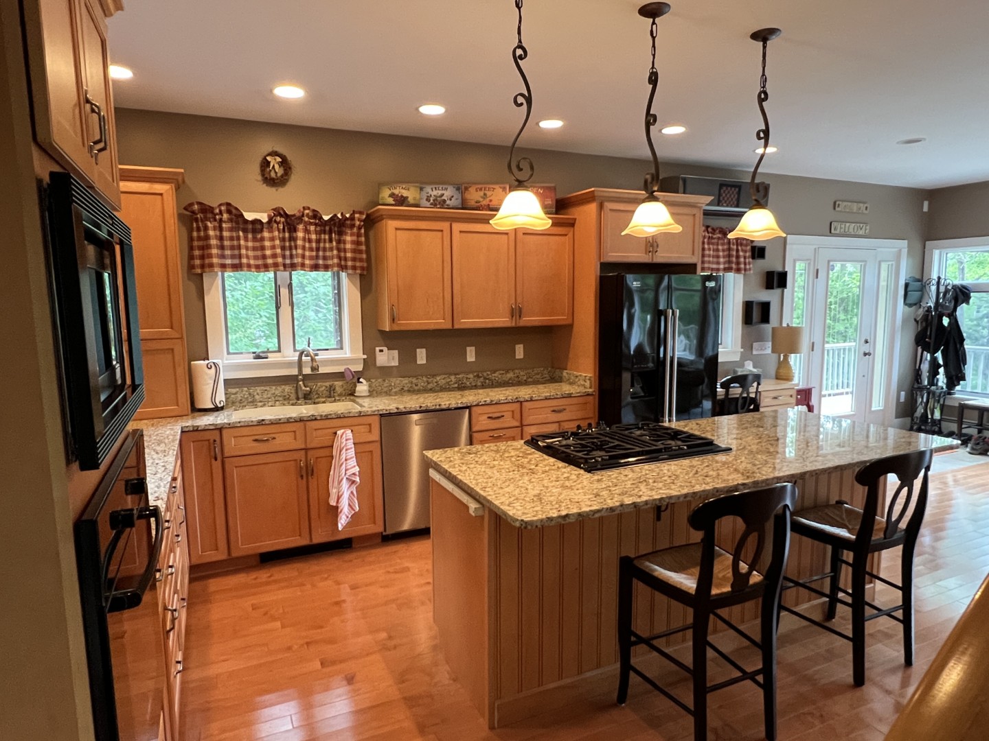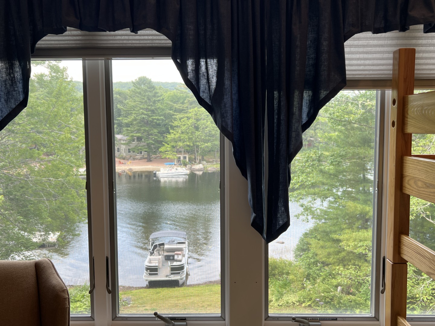 This year round home offers pond enjoyment through all the seasons. The nicely laid out kitchen has lots of storage with gas cook top and electric oven. There is plenty of dining room space for large gatherings or comfy chairs for watching pond activity. 9ft high ceilings add to the spacious feeling. The large living room has sliding glass doors to the deck and a propane stove for those cool mornings/evenings.